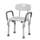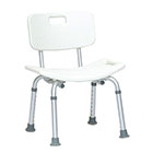 The ProBasicsĀ® Shower Chair with Back is made from durable, anodized aluminum and has multiple features for added peace of mind. With non-marring rubber tips, angled legs to resist tipping and an easy-to-clean plastic seat with drainage holes, users can feel confident using this shower chair.